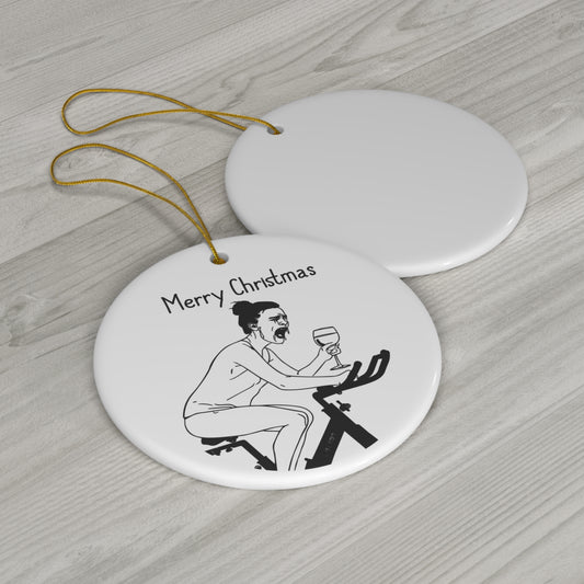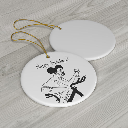 Happy Holidays! Funny Ceramic Ornament | Woman Crying on Peloton with Wine | Hilarious Holiday Gift for Moms | Christmas gifts | Holiday Humor
